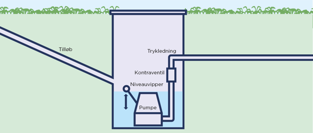 Bor du i et hus med kælder, hvor afløbet ligger lavt i forhold til kloaksystemet i dit boligområde, er en pumpebrønd måske en god løsning for dig. Pumpen opsamler spildevandet fra gulvafløbet og/eller toilettet og pumper det op i kloakken. Derved undgår man, at din kælder oversvømmes af spildevand som ikke kan rummes i kloakrørene ved kraftige regnmængder. I pumpen sidder en kontraventil der sikrer, at vandet ikke kan løbe den forkerte vej.